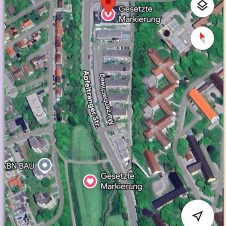 Die beiden gesetzten Markierungen zeigen die Entfernung vom Kindergarten zum zweiten Gartengrundstück am Märzenbach.