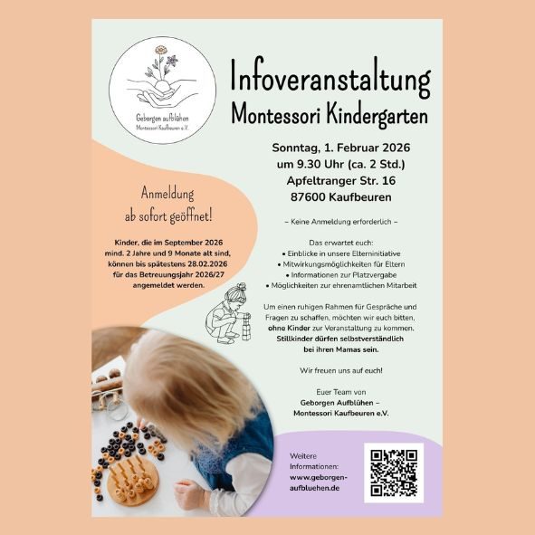 Geborgen aufblühen – Montessori Kaufbeuren e.V. hat das Ziel, einen liebevollen und naturnahen Kindergarten zu gründen, in dem Kinder individuell begleitet und in ihrer Selbstständigkeit gestärkt werden. Nach dem Motto „Hilf mir, es selbst zu tun“ steht die Montessori-Pädagogik im Mittelpunkt unserer Vision. Die Kinder sollen in einer Umgebung voller Geborgenheit, Freude und Respekt lernen und aufwachsen dürfen. Naturerfahrungen und Nachhaltigkeit sind dabei zentrale Bestandteile unseres Konzepts. Gemeinsam mit Eltern und der Stadt möchten wir einen Ort schaffen, an dem Kinder Wurzeln schlagen, wachsen und aufblühen können.